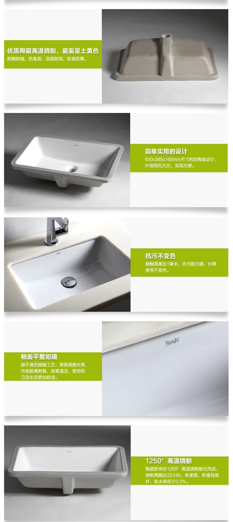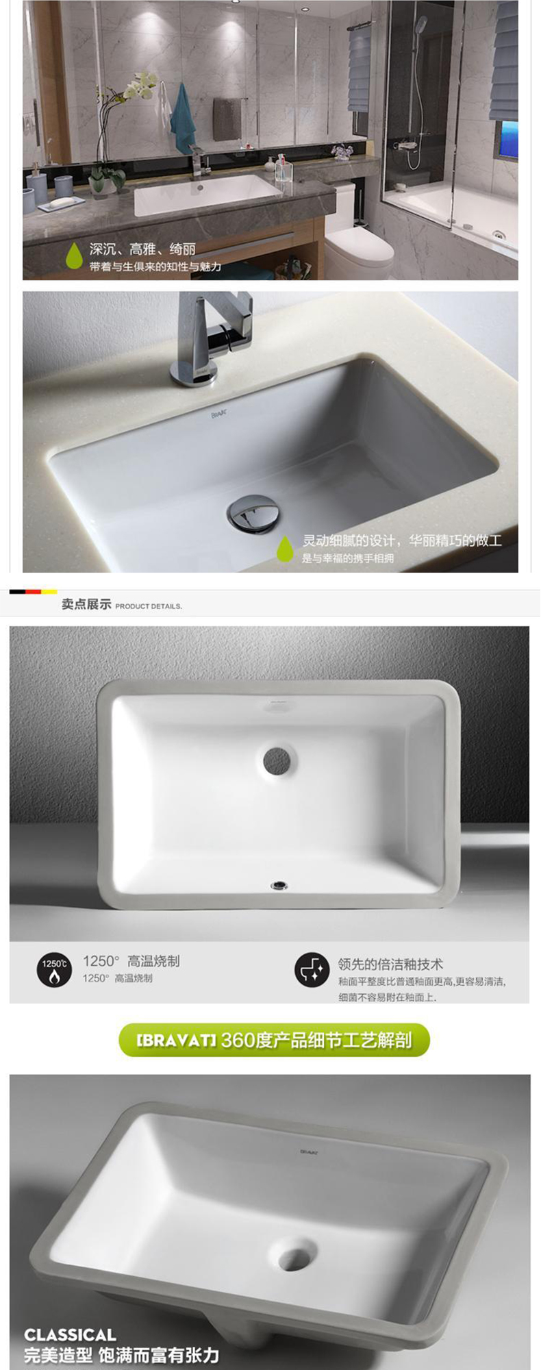 贝朗(BRAVAT)|面盆龙头,-贝朗方形嵌入式台下盆洗手盆C22171W