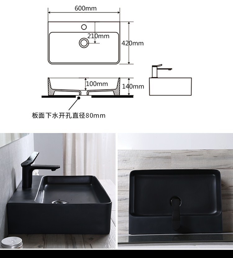 卫欲无限 北欧简约黑色方形陶瓷台上盆面盆YT04 >