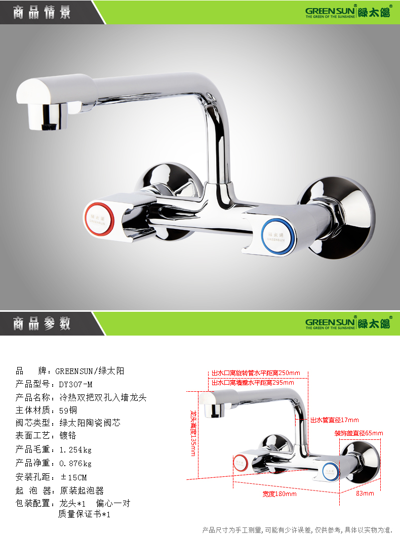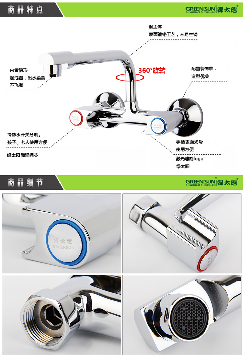 绿太阳|面盆龙头,-绿太阳 墙出水冷热双控厨房龙头DY307-M【包安装】
